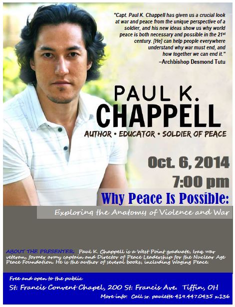 Mark your calendars! On Oct. 6, PPJ will be carpooling to Tiffin to hear Iraq War veteran Paul Chappell speak on “Why Peace is Possible: Exploring the Anatomy of Violence and War.” Details below. To join our carpool, call Josie at 419-332-2318.