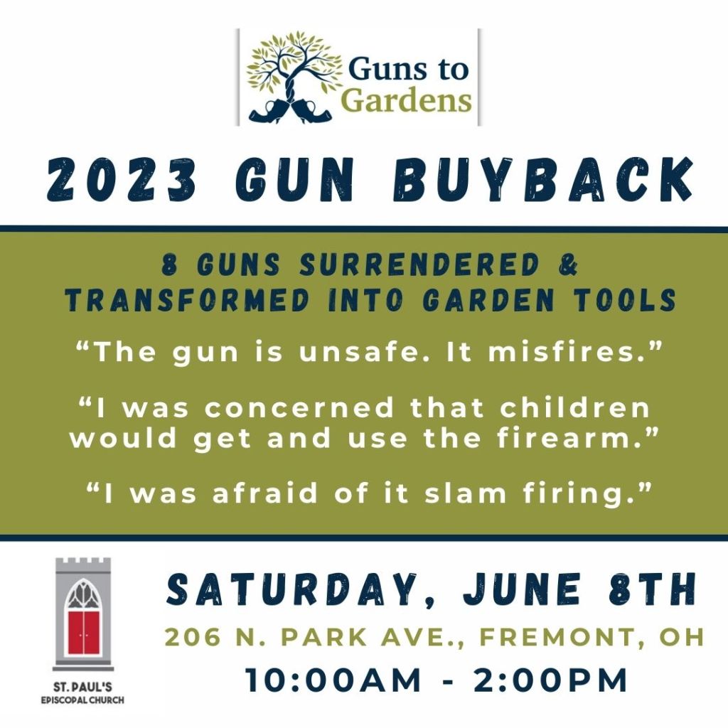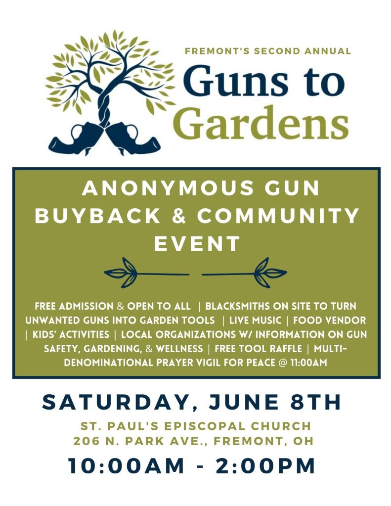All are invited to the second annual GUNS TO GARDENS, a gun safety event on Saturday, June 8, 2024, from 10am – 2pm. The event is in the parking lot behind St. Paul’s Episcopal Church, 206 North Park Avenue, Fremont, Ohio. (https://www.stpaulsfremont.org/guns-to-gardens.html) GUNS TO GARDENS stems from Isaiah 2:4 and Micah 4:3 that speak of an end to war by forging swords into gardening tools. Last year one grandfather turning in a gun expressed, “I was concerned that children would get and use the firearm.” Another donor said, “The gun is unsafe. It misfires.”