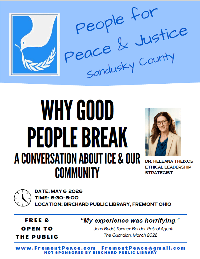 Join PPJ as we welcome Dr. Heleana Theixos on May 6th, 2026, 6:30 pm, at Birchard Public Library for a conversation about ICE and our community, entitled “Why Good People Break.”