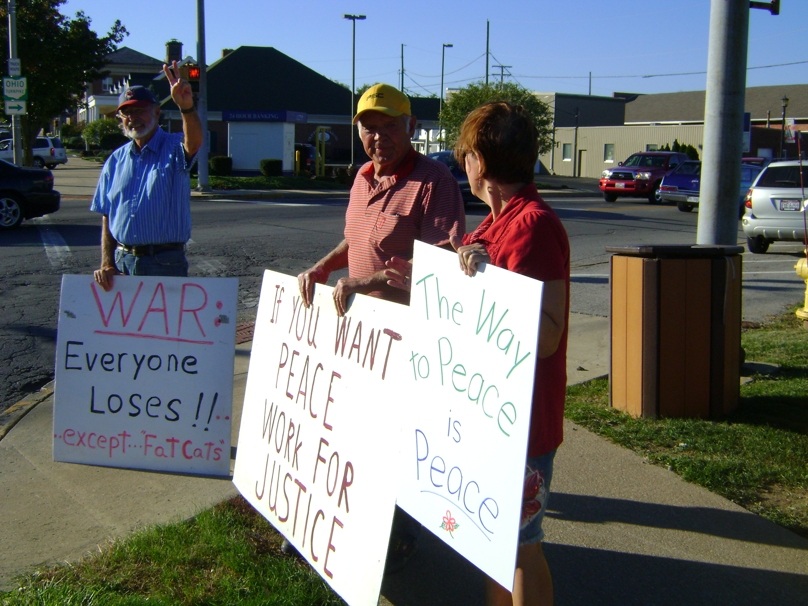 PPJ’s weekly vigils for peace and justice take place on Wednesdays at the corner of Front and State St. Fremont, Ohio.